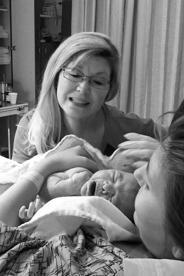 She positioned me on my knees on the bed leaning over the raised top, supported by pillows. It was slightly more bearable. She got tough with me and helped me to focus on my breathing and remaining calm. Within a few minutes (that felt like hours), the pressure I had been feeling for a while suddenly intensified tremendously and I couldn't resist the urge to push. She checked again and I was at 8cm. She called in the delivery team and things took off. I was trying so hard not to push, but I was in transition and there was nothing I could do to stop my body. I was sweating and shivering and terrified. Before I knew it I was flipped over and the doctor I'd met only once was putting me in stirrups and telling me it was time to push. A few pushes later Christine said I could feel her head if I wanted. I'm good, I responded, not wanting to interact with anything below the waist at all. A contraction or two later I felt the first tear. It was a searing white hot pain and I was so sure I was about to meet her. Everything I read about tears said that they happened as you delivered, not as you pushed, they would surely be perineal, and that the nerves would be stretched so tightly you wouldn't even feel them.